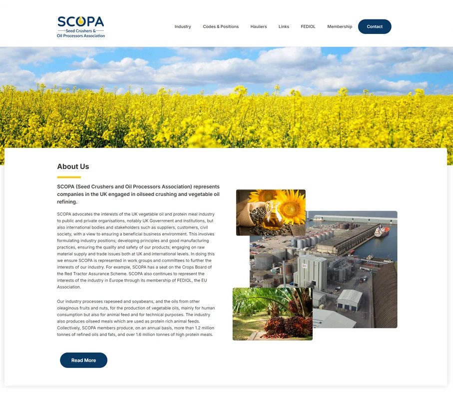 A custom WordPress corporate website developed for SCOPA, the UK trade association representing companies in the oilseed crushing and vegetable oil processing industry. The site clearly communicates the organisation’s mission, industry information, membership benefits, and codes of practice, helping stakeholders access essential resources, regulatory positions, haulier standards, and affiliated links with ease. Built for clarity and usability, the site features structured content, intuitive navigation, and a clean layout that supports ongoing content management through the WordPress CMS.